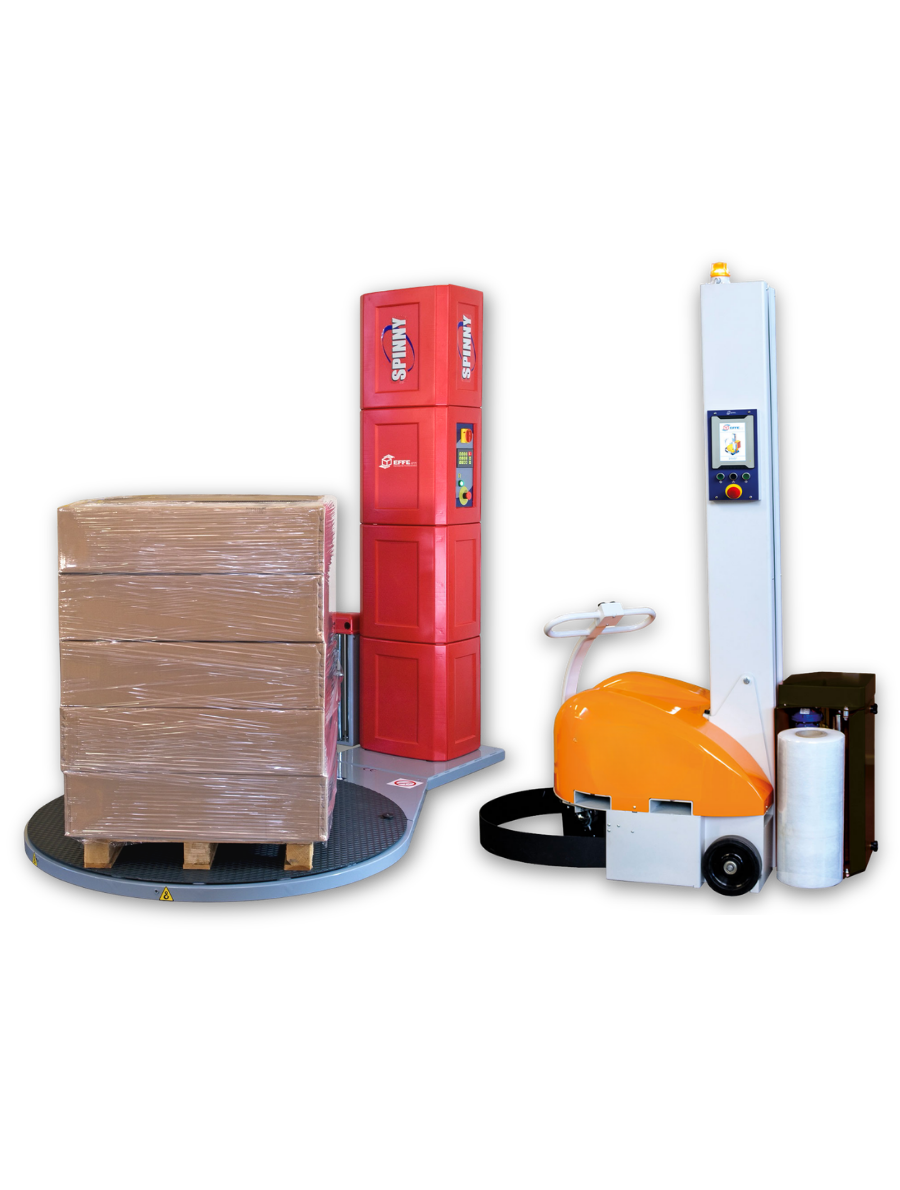 - Banderoleuse à bras tournant : multi-usage, permet de transporter et filmer les palettes avec une seule machine.